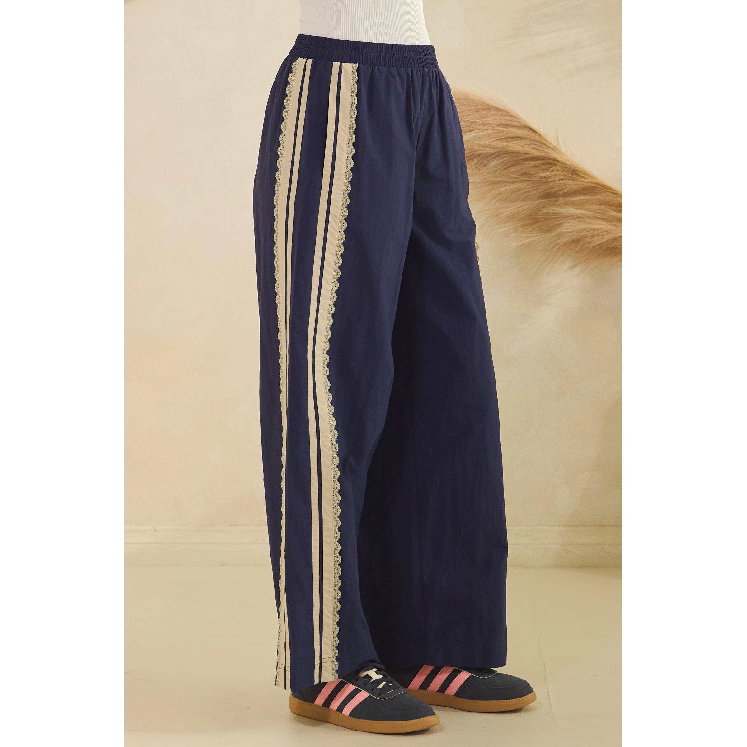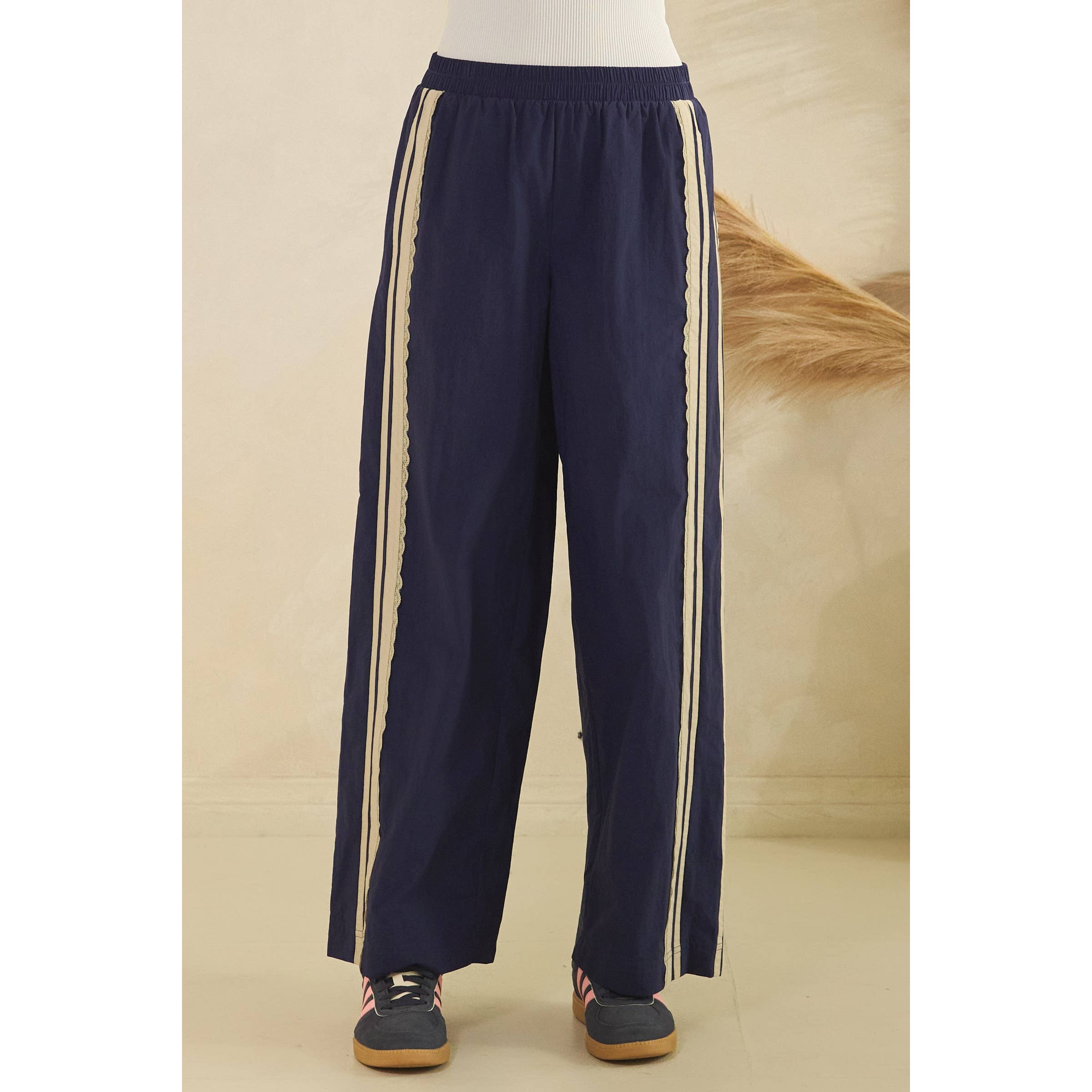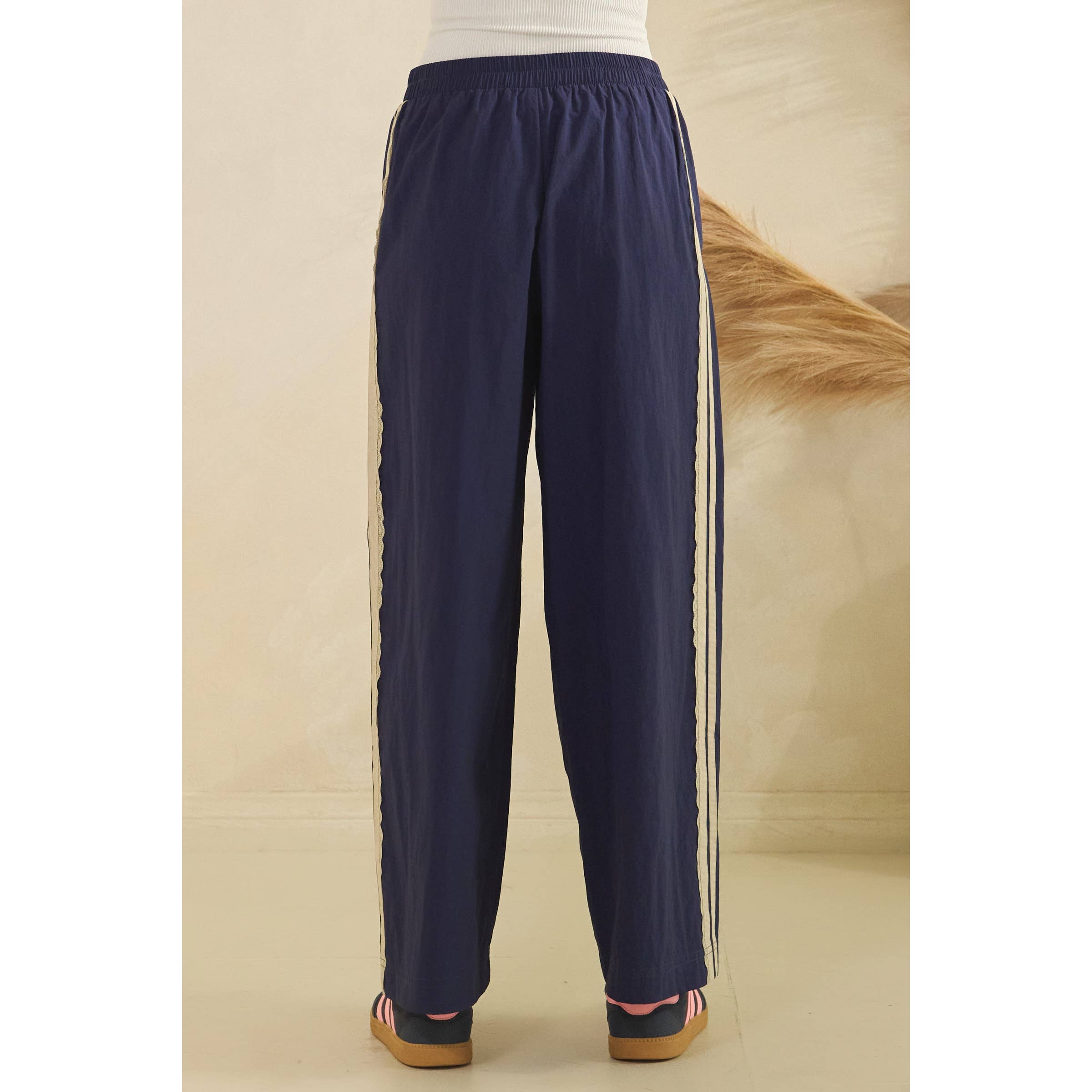 Sporty style with a feminine twist, these track pants are the perfect blend of comfort and elevated casual. Designed with a relaxed, easy silhouette, they feature a lightweight woven fabric and delicate lace trim running down the side panels for a subtle, standout detail. The elastic waistband offers an effortless pull-on fit, making them ideal for travel days, weekend errands, or styled up with a simple tank and sneakers.