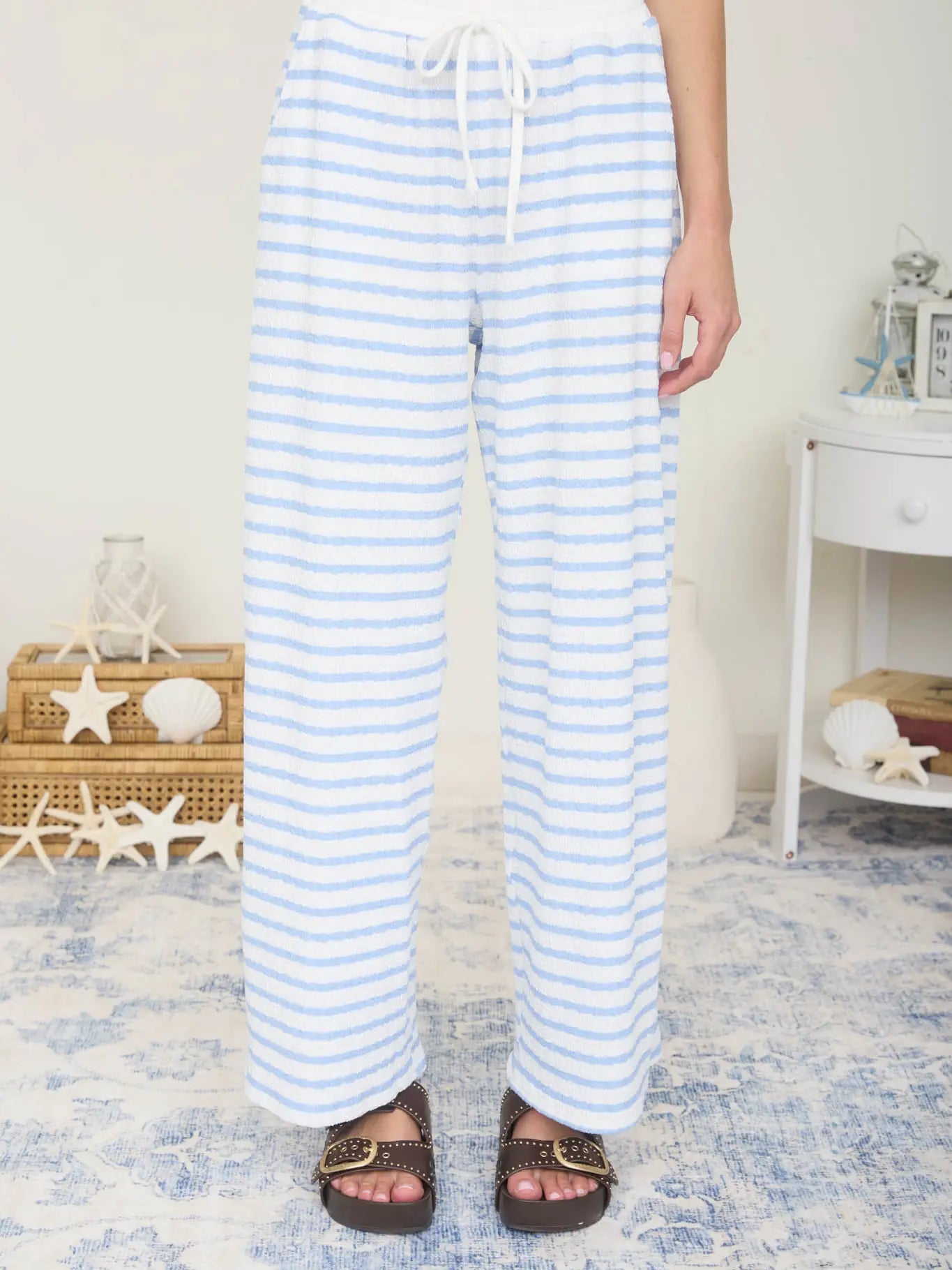 Easy, breezy comfort with a relaxed coastal vibe. The Foster Lounge Pants feature a high-rise elastic waistband with adjustable drawstring for a comfortable, flexible fit. The wide-leg silhouette and soft textured stripe knit give them an effortless feel that’s perfect for travel days, beach walks, or laid-back weekends.