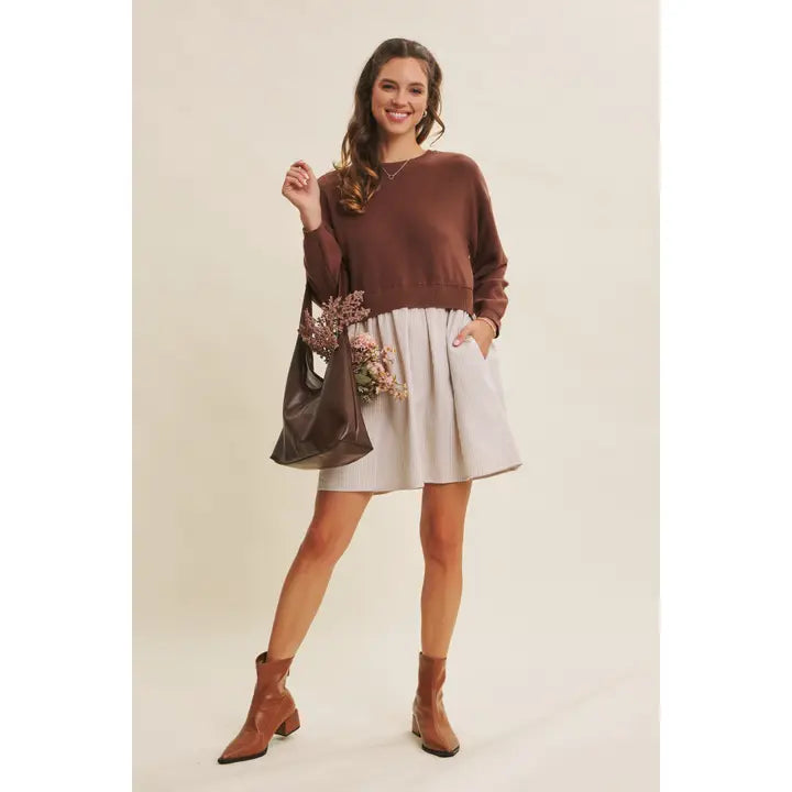 A cozy-meets-playful look, this twofer dress combines the comfort of a sweater with the charm of a mini dress silhouette. The soft knit top features a classic round neckline and long sleeves, while the contrast striped skirt adds gentle volume and movement. What truly sets this piece apart is the open-back detail finished with two oversized self-tie ribbons—creating a statement from every angle. Effortless to wear yet thoughtfully designed, it’s a transitional piece that makes styling simple. Just pair with boots and you're ready for a crisp-weather stroll or an easy coffee date. The subtle A-line skirt is finished with functional side pockets for added ease. Designed to feel both special and wearable, this piece captures the relaxed elegance IN FEBRUARY is known for—soft, sweet, and quietly refined. Features - Long-sleeves - Sweater top - Stripe skirt - Twofer mini - Back ribbon tie - Side pockets - Round neck Size + Fit Model is 5'9.5" and wearing a size S.