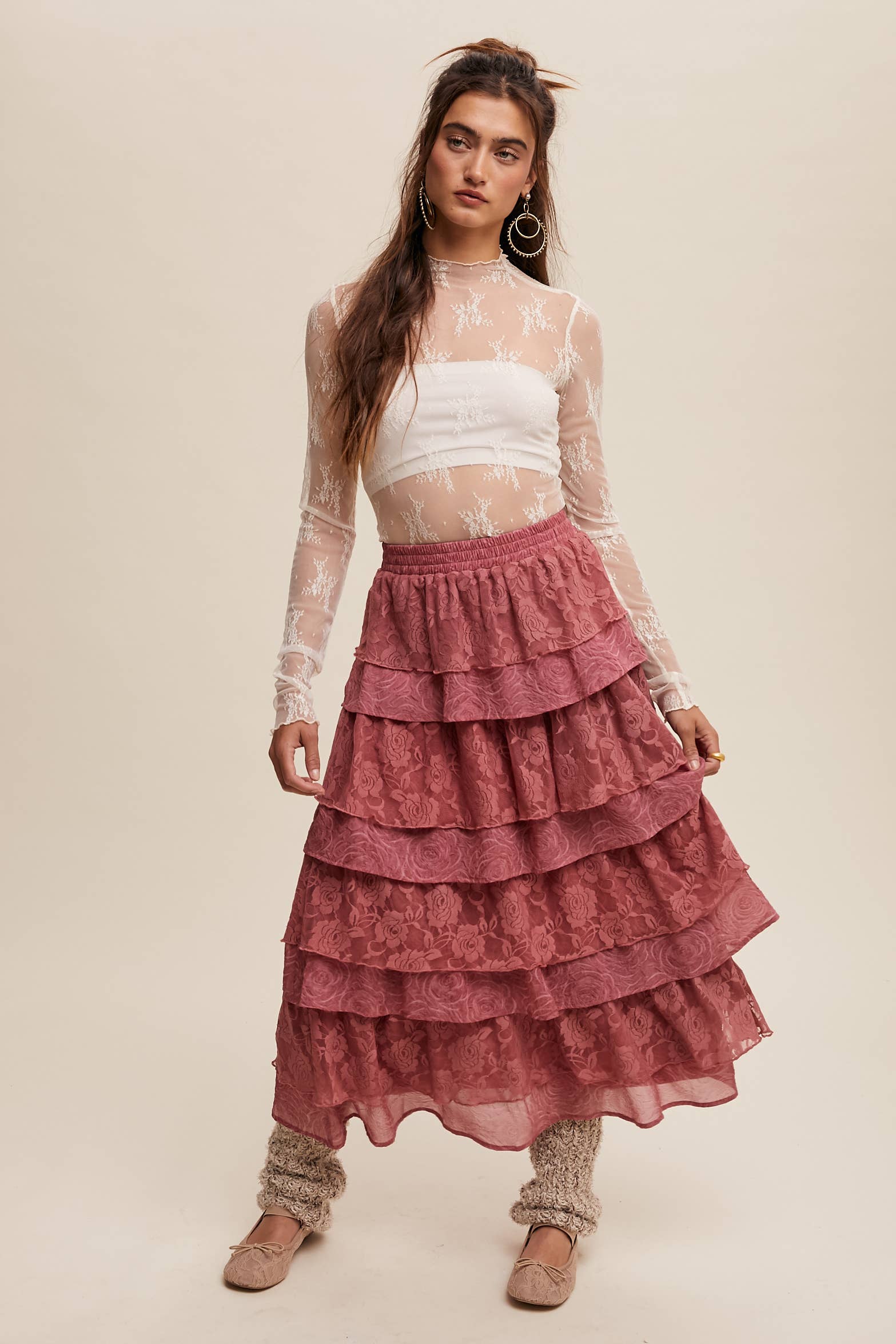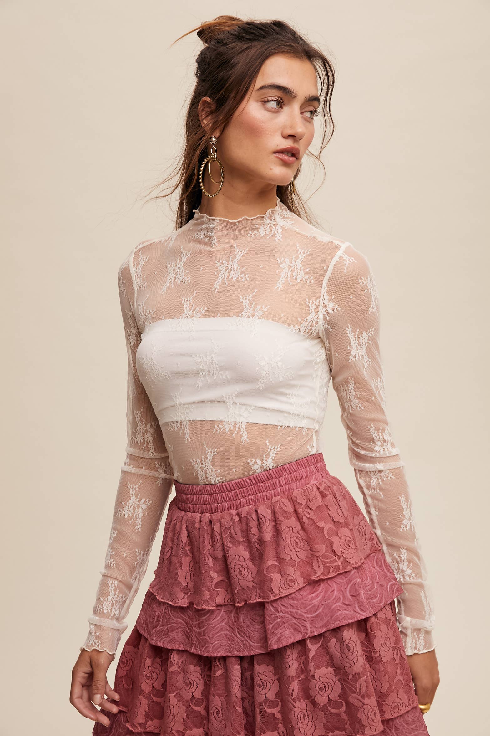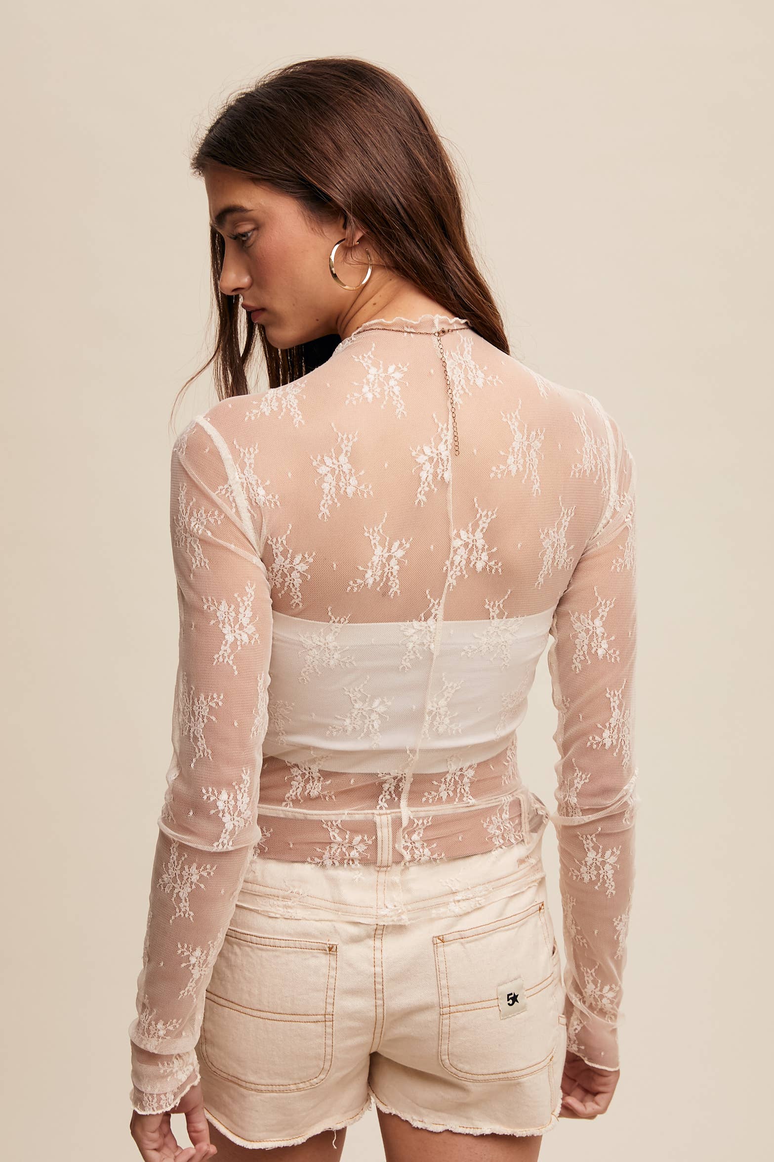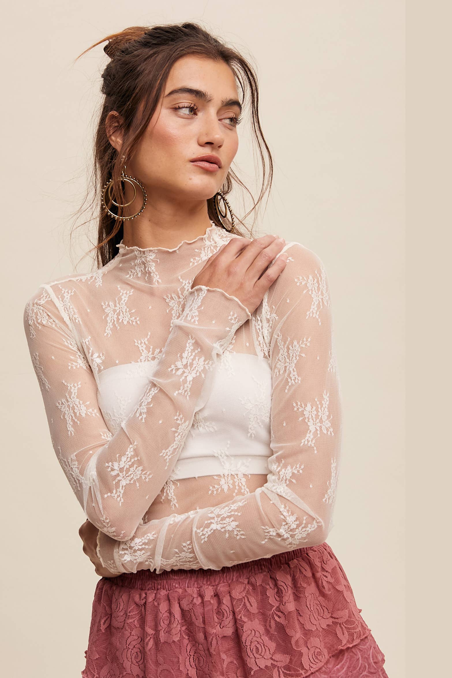 This Sheer Lace Long-Sleeve Top showcases a beautiful floral lace pattern for a classic, romantic vibe. Crafted from lightweight, semi-transparent fabric, it offers an airy feel perfect for layering. The slim fit gently contours the body, making it great for any occasion. Featuring a delicate high neckline with scalloped edges and sheer long sleeves finished with elegant scalloped hems, this unlined top provides versatile styling options when paired with different camisoles or bralettes.