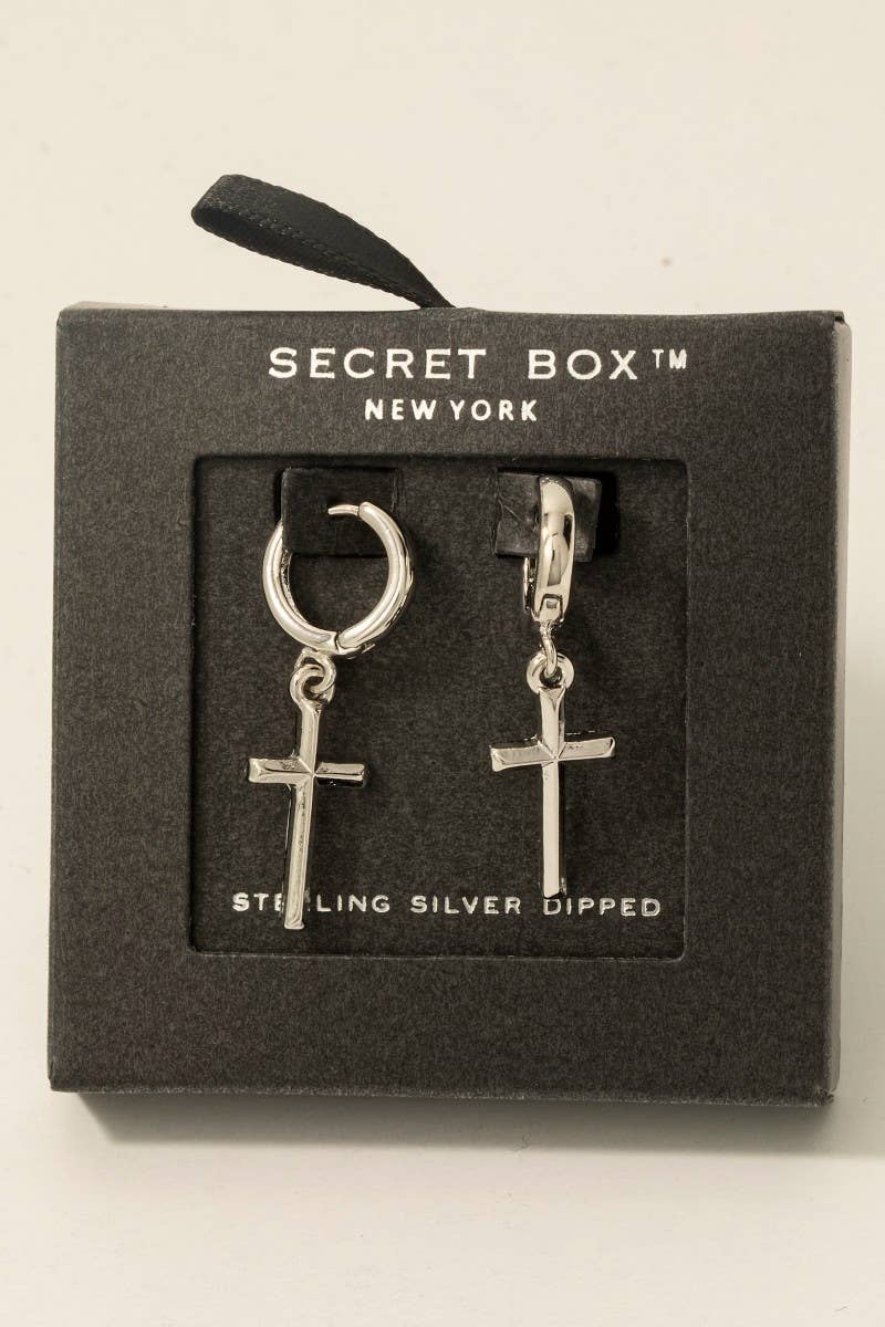 This pair of hoop earrings showcases a timeless secret box gold dipped cross charm style. Unveil a new dimension of sophistication as this pair of hoop earrings effortlessly enhances the elegance of your ensemble.