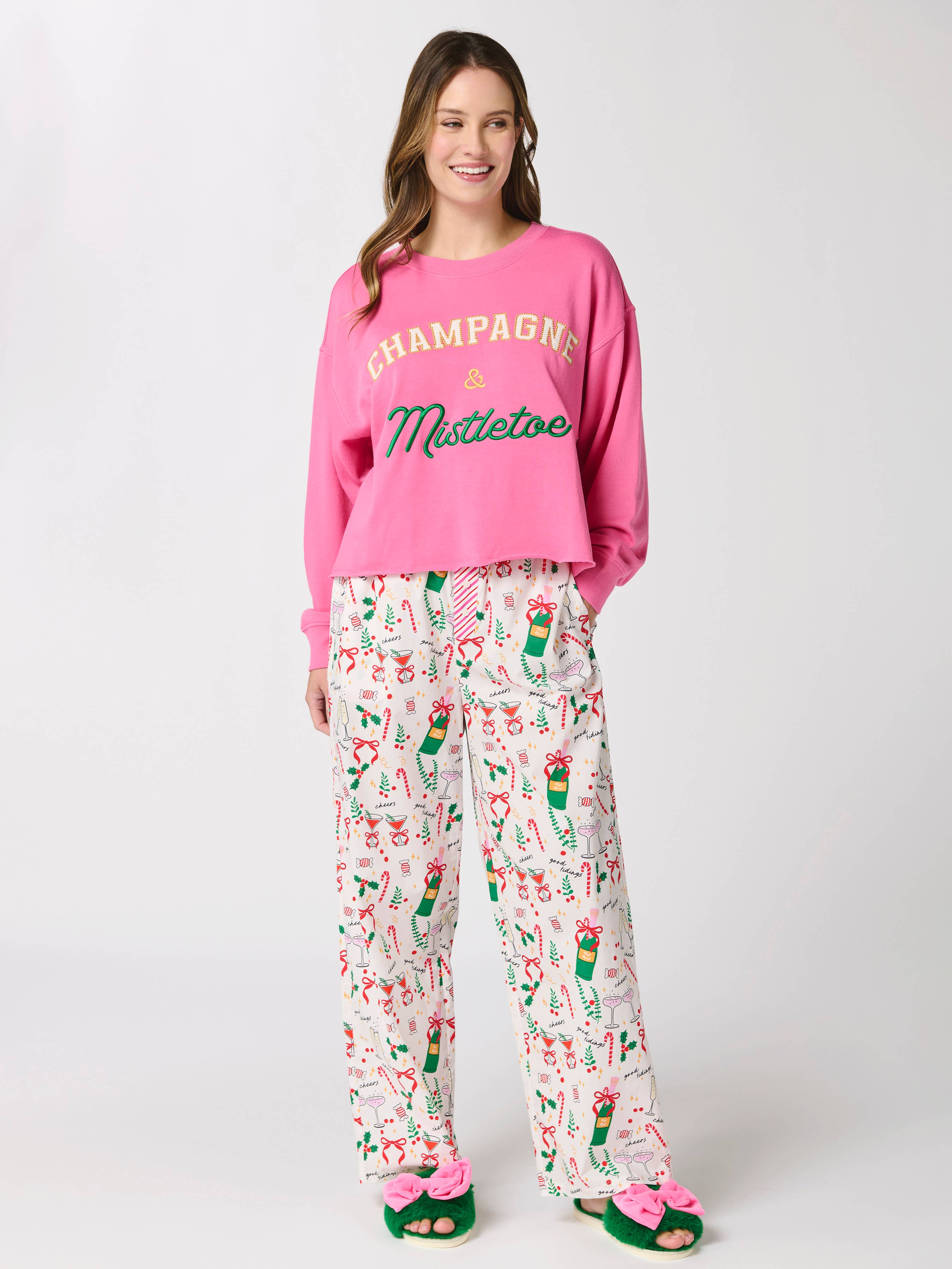Made from 53% cotton and 47% polyester. Machine wash, tumble dry low, Pop the bubbly and bring on the cozy with our “Champagne & Mistletoe” Lounge Sweatshirt. This festive favorite features a bright pink base and playful text in gold and green embroidery that instantly puts you in the holiday spirit. With its relaxed fit and soft fabric, it’s perfect for sipping, snacking, and snuggling all season long. Pair it with our matching Celebration Boxer Shorts or Celebration Boxer Pants—or mix and match with other merry lounge styles for a full-on festive vibe!