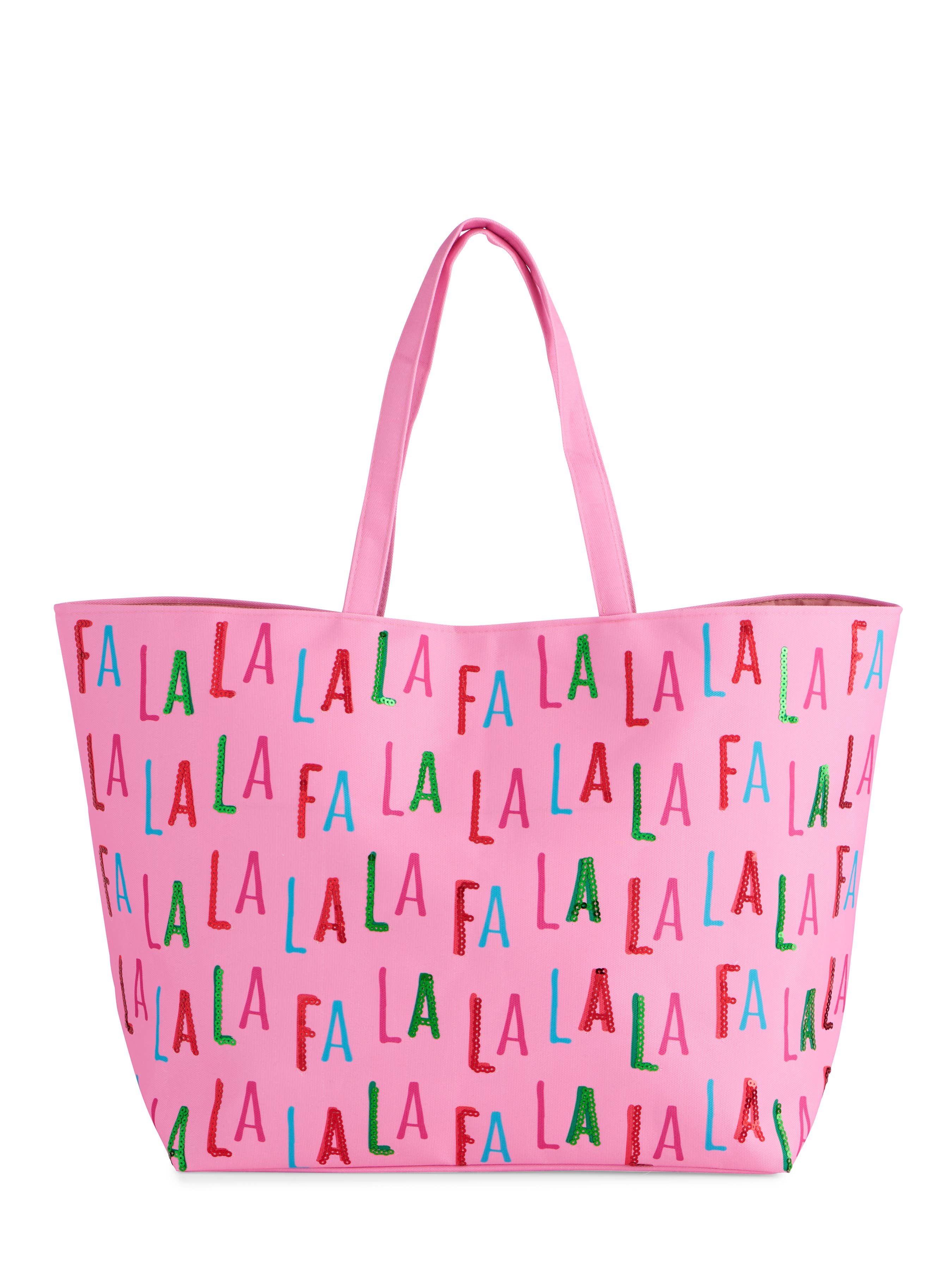 Measures L 24.5" x W 8.5" x H 15.75"; Strap 11"Made from polyester and sequins, Spread some holiday cheer with the “Fa La La” Gifting Tote, the perfect carryall for all your festive errands and gifting needs. This oversized tote features bold, multicolored “Fa La La” lettering with pops of sequin sparkle for a playful, eye-catching touch. Designed with double shoulder straps and a secure snap closure, it’s roomy enough for presents, party supplies, or a weekend getaway. Whether you're headed to a gift exchange or just running around town, this bag brings the celebration with you.