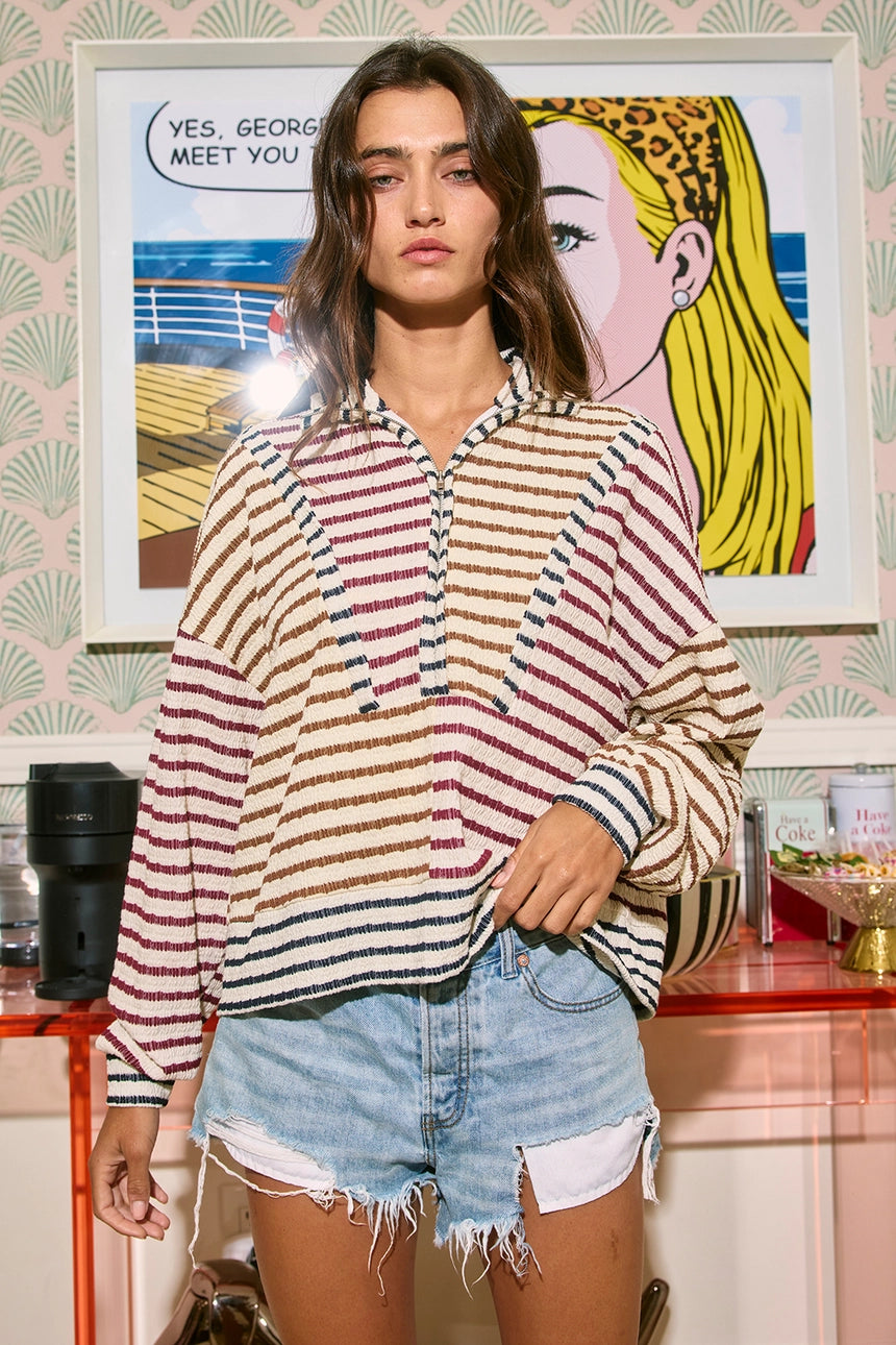 Oversized Funnel-Neck Half Zip Contrast Details Striped Top