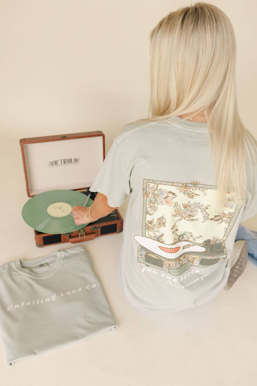Back: Inspired by the timeless charm of a vintage record player and the softness of spring blooms.