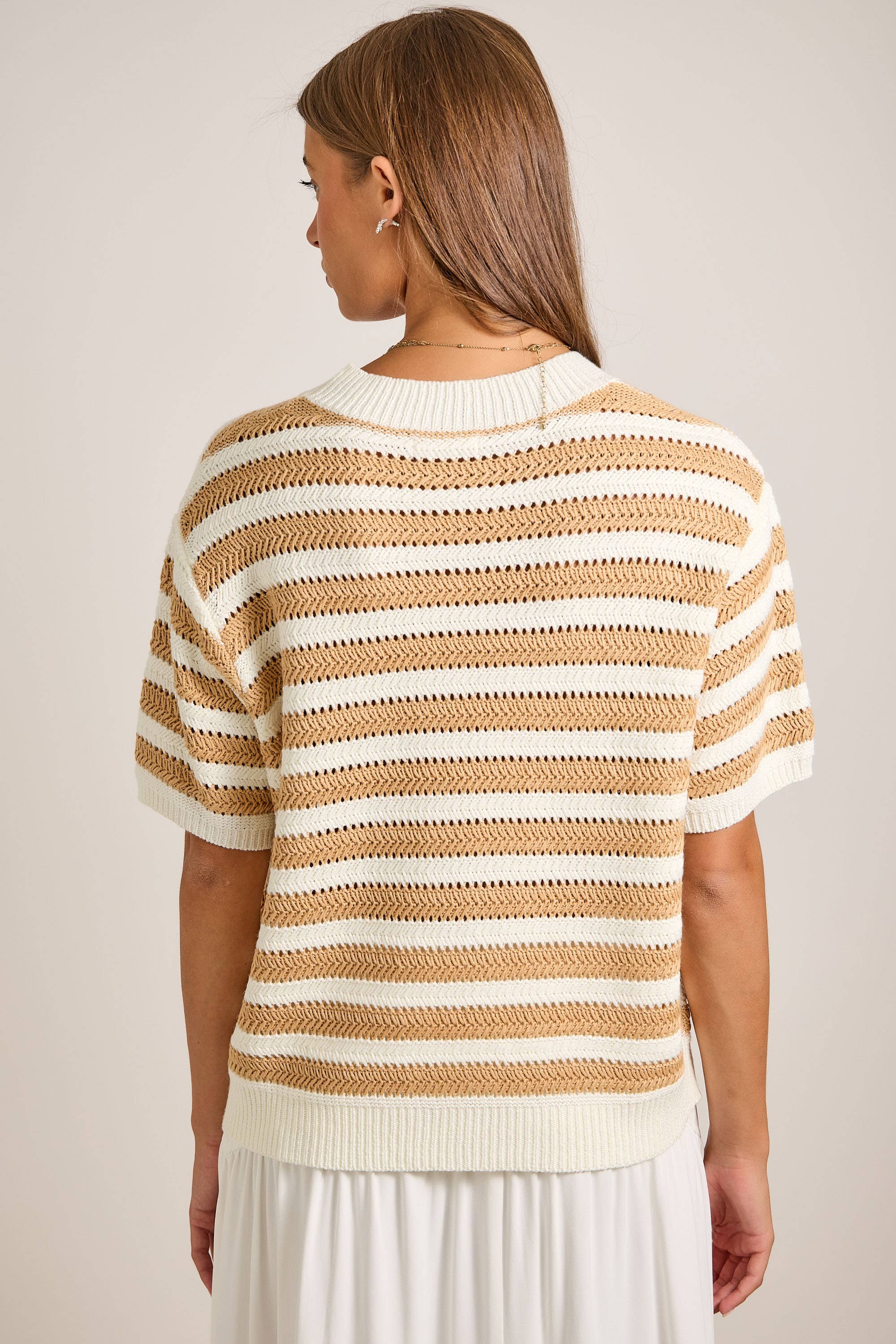 Designed with a flattering V-neckline and short sleeves, this cardigan can be worn buttoned as a top or layered over a tank for an easy, relaxed look. The soft knit and slightly relaxed fit make it comfortable for all-day wear while still feeling polished.