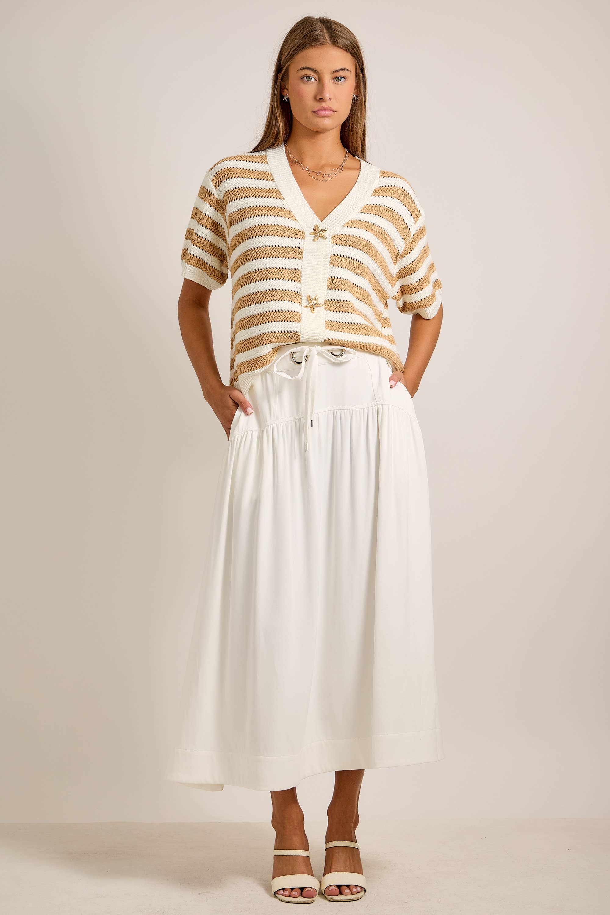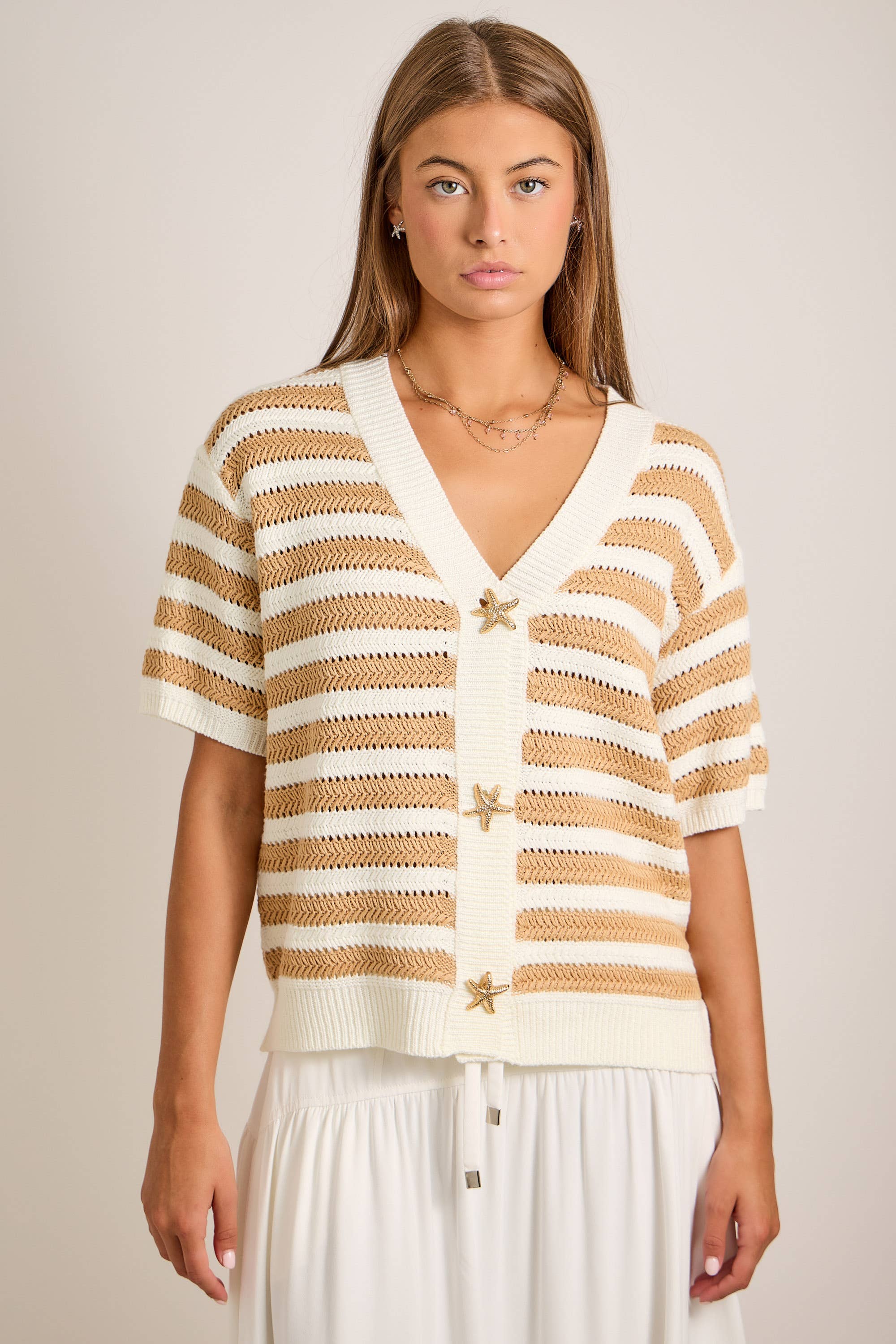 The Annika Nautical Stripe Cardigan is the perfect blend of classic and playful. Featuring timeless nautical stripes and charming starfish buttons, this lightweight knit adds a fun coastal touch to your everyday wardrobe.