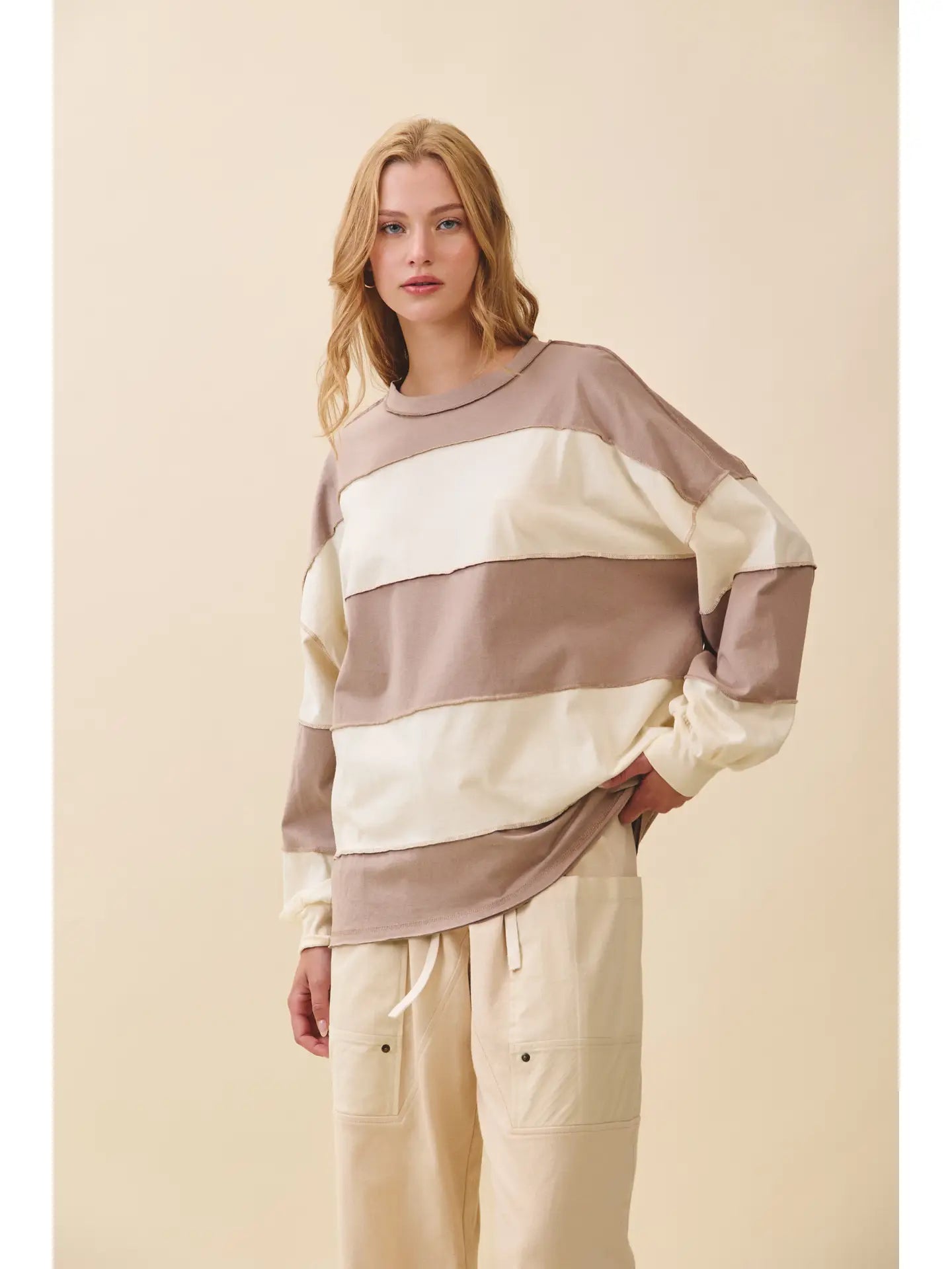 She’s got that easy, throw-on-and-go energy with bold paneling and a loose, boxy fit. Soft seams and laid-back lines make her the perfect cozy top for breezy days and chill nights.