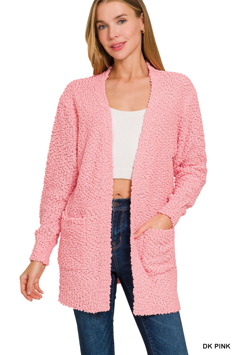 LONG SLEEVE POPCORN SWEATER CARDIGAN WITH POCKETS